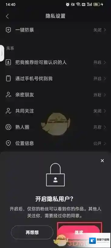 6、点击过继续之后在点击设置为隐私用户即可。