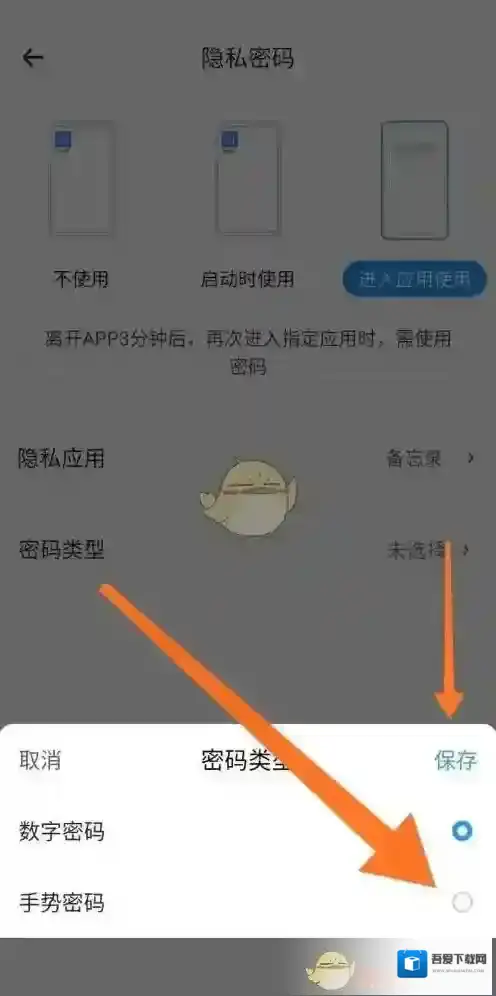 《时光序》手势密码设置方法 2025-08-03 13:35:45 编辑:野区小仙女 分类:应用教程 • 阅读:511 1、打开时光序APP,点击右下角我的,再点击数据安全。 3、点击应用使用。 4、勾选手势密码。 5、设置新的手势密码即可。 本文内容来源于互联网,如有侵权请联系删除。 时光序应用相关内容 全部 时光序 时光序手势密码 时光序点击 时光序数据安全 时光序设置 山海镜花蜚怎么样 蜚属性传记介绍 山海镜花蜚怎么样 蜚属性传记介绍 山海镜花镜灵图鉴 攻击:S(-)生命:A(-)防御:B(-)速度:C(-)暴击:D(-)暴击伤害:S(-)效果命中:A(-)效果抵抗:B(-)“当心点,我的小心肝,你被伤到了可不行~” 在刺耳的狞笑中一颗硕大的蛇头升... 2025-07-29 《时光序》提醒铃声更换方法 1、打开时光序app,然后打开我的页面。 2、在我的页面里就可以看到有个铃声定制。 3、然后打开铃声定制页面,然后打开通知音效。 4、然后进入到通知音效页面之后,就可以选择铃声通知类型和铃声啦。 5、一般选择铃声+震动比较不会错过信息,喜欢那个铃声直... 2025-07-29 发表回复 请登录后评论... 登录后才能评论 评论列表 (0条)