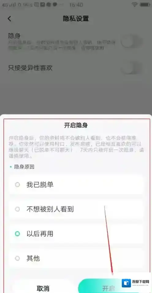 《青藤之恋》隐身开启方法 2025-08-04 22:53:40 编辑:小镜子 分类:应用教程 • 阅读:841 1、开启青藤之恋APP,点击右下角我的。 2、选择设置。 3、找到隐私设置。 4、点击隐身按钮,接着选择隐身原因,再点击开启。 本文内容来源于互联网,如有侵权请联系删除。 青藤之恋应用相关内容 全部 青藤之恋开启 青藤之恋 青藤之恋隐私设置 青藤之恋点击 青藤之恋隐身 《青藤之恋》关闭互相喜欢消息通知方法 在青藤之恋这样的社交应用中,用户之间通过互相喜欢来建立初步的联系。然而,对于部分用户而言,频繁的互相喜欢通知可能会成为一种负担,尤其是在工作繁忙或需要专注时。因此,关闭这些通知成为了一种迫切的需求,旨在提高用户的使用体验,减少不必要的干扰。 4、选择... 2025-08-19 发表回复 请登录后评论... 登录后才能评论 评论列表 (0条)