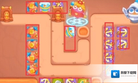 6、具体炮塔如下,鞭炮加船锚,每个区域放置一个雪球塔减速。
