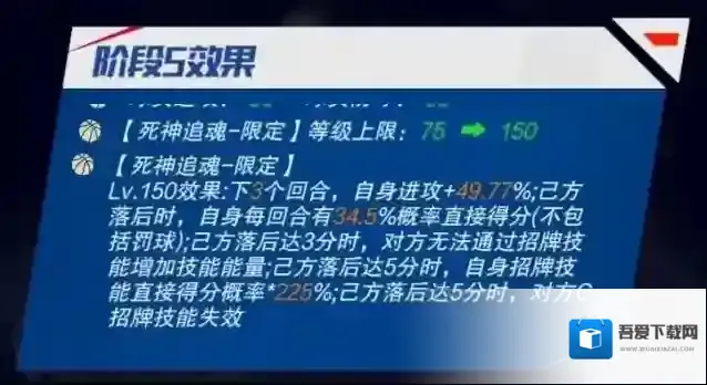 势如疾风-限定:下X个回合,自身2分+X%;自身每回合2分-X%;己方每次气势爆发后,己方全队体能+X;且己方X%概率获得Y点技能能量;己方气势爆发后,会保留X点气势值,可叠加Y次;己方每次落后时,己方全队招牌技能X%回合数+Y。(预计在上线同时开启迈向巅峰)