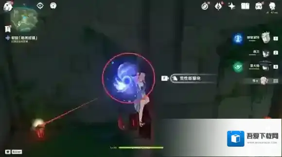 交互机关后进入解密视角,将下图目标处的能量移动至右上角的红色按钮之中。