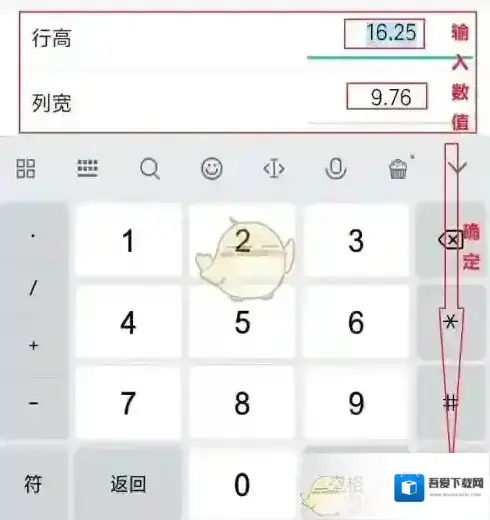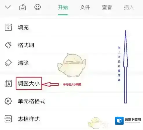 5、打开上述图标后,在界面内一直向上滑动到*底端,找到“调整大小”并点击,输入所需的单元格大小点击“回车”即可。