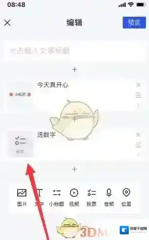 2、然后进入到编辑页面,点开加号在弹出页面里找到投票