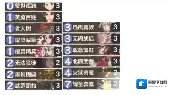 繁世孤雏*3、英勇百姓*3、食人树*3、耀灵军策士*3、耀灵精兵*3、爆裂傀儡 *3、 无法狂徒*2、 武罗黑豹*3、迅岚翼族*3、无间战侣*3、战意如虹*3、北辰武者*3、火狱兽魔*3、辉圣奔流*2。