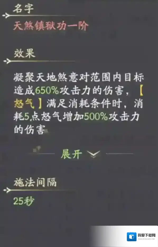 技能介绍:凝聚天地煞意对范围内目标造成650%攻击力的伤害,怒气满足消耗条件时,消耗5点怒气增加500%攻击力的伤害。