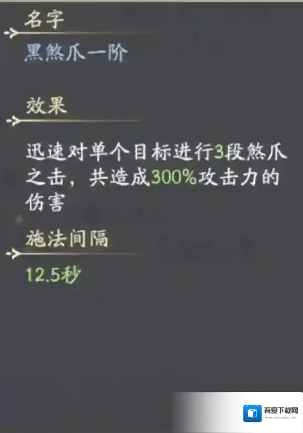 ●技能介绍:迅速对单个目标进行3段煞爪之击,共造成300%攻击力的伤害