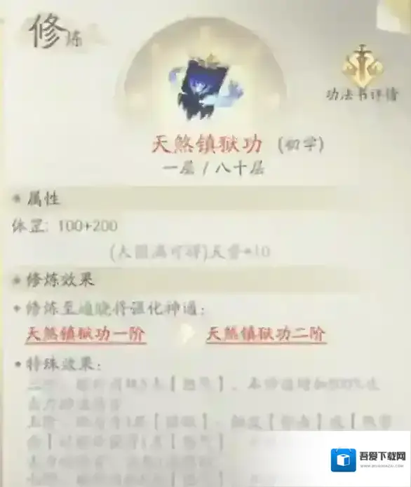 来历:源自仙界魔域中的天煞神像上的玄文,前三层就能够打通全身四百五十处玄窍若能找齐四尊雕像,更是能够打通一千八百玄窍,但修炼时需要真灵血脉。