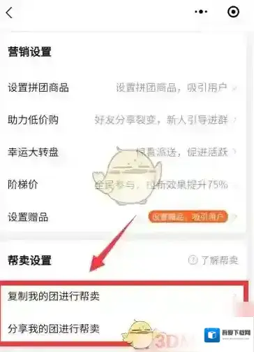 5、找到“帮卖设置”,点击“分享我的团进行帮忙”。