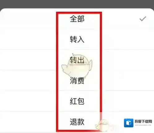 7、比如点击全部,可以按照转入、转出、消费、红包、退款的项目来查看;点击时间,可以选择月份查看当月的账单明细。