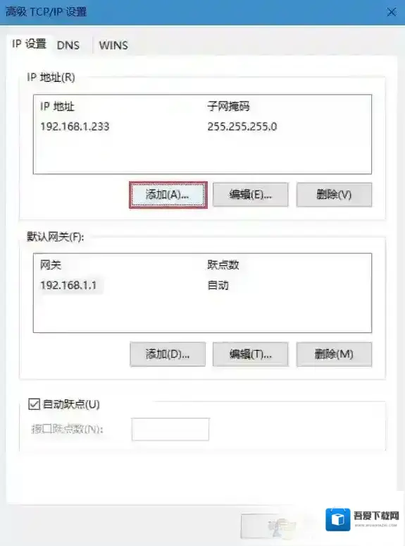 6.然后点击下方的“高级”按钮,在高级选项中点击上方的“添加”: