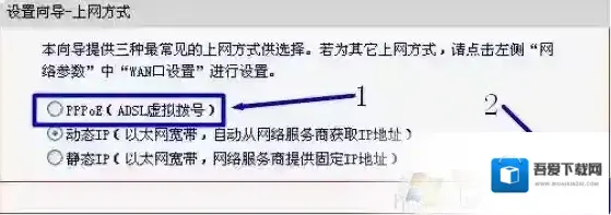 3、选择上网方式:请根据你的入网方式进行选择,目前国内ISP宽带运营商为普通用户提供的大多数是“PPPOE(ADSL虚拟拨号)”的上网方式,本例也以这种方式进行演示。