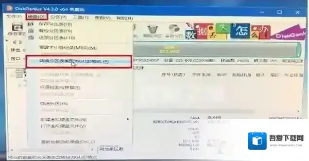 第四步:微PE装Win10系统之分区如果是UEFI模式,那么需要进行UEFI方式分区,具备ESP分区和MSR分区,如果是普通BIOS方式启动,那么只需要直接快速分区。1、点击分区工具最上方的“硬盘”选项卡,弹出菜单之后点击“转换分区表类型为GUID格式”,如下图所示。