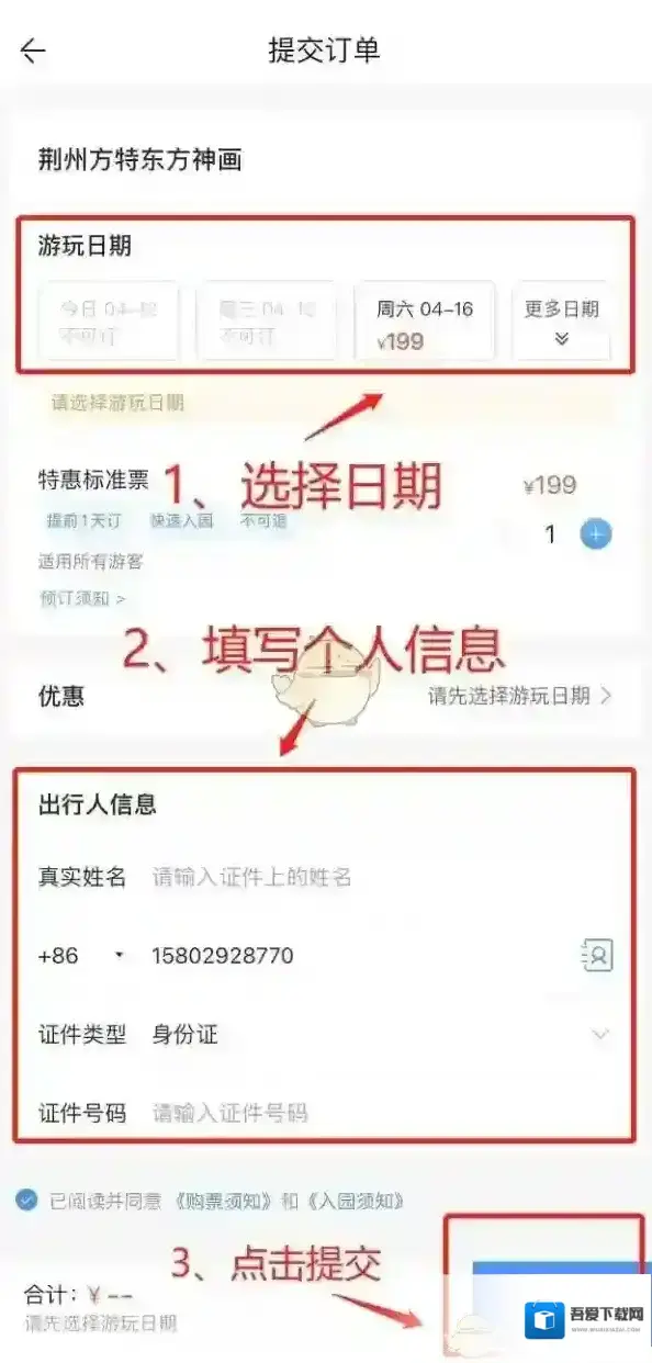 5、进入提交订单页面后,选择“游玩日期”并按照要求填写姓名、手机号码、证件类型及证件号码后点击“提交订单”,付款成功后弹出购票成功页面。