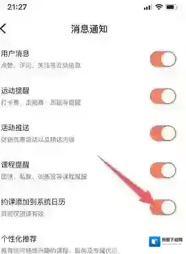 打开乐刻运动APP,进入“我的”页面,点击右上角的设置图标,进入设置界面后找到并点击“消息通知”,然后开启“添加到系统日历”功能,最后在弹出的允许访问日历提醒小框中点击“好”即可。这样设置后,乐刻运动的新课程提醒就会自动同步到系统日历中,方便用户随时查看和安排自己的运动计划。
