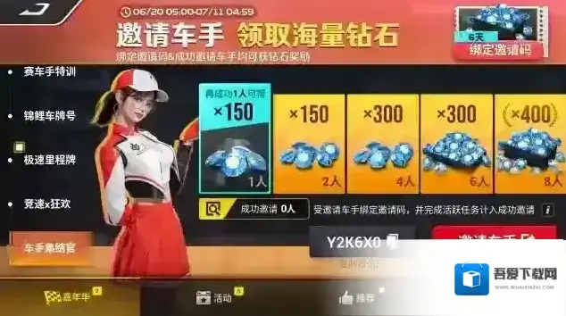 ⑧车手集结官:车手们邀请好友一起体验游戏,可以领取钻石奖励。活动期间车手们每邀请1位好友可以领取150钻石,最多可以获得5次奖励。值得注意的是,受邀车手们绑定邀请码可以获得80钻石,完成绑定活跃任务,才会被计入成功邀请。