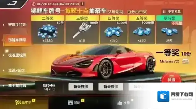 ⑥锦鲤车牌号,整点抽豪车:活动期间车手们完成每日竞速任务可以领取幸运车牌号,拥有幸运车牌号即可参与每天22点的“整点抽豪车”活动玩法。活动玩法奖池中包括Mclaren 720S Coupe’17、2888钻石、抽奖券*10、588钻石、288钻石,每天参与活动玩法即使不中大奖,也可以获得参与奖60钻石。