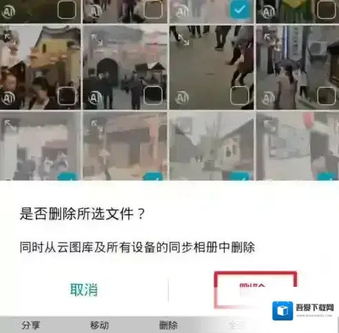 6、点击后,在下方的是否删除所选文件中,点击删除的选项即可。通过删除无用的云照片,即可释放云空间;