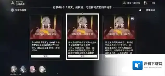 休整层中在商店里选第一个花80碎片买1星祝福。不要选最后一个随机强化,虽然看起来很赚,但实际上如果没强化到关键祝福的话是很亏的,买祝福至少还能凑祝福数量,尽早凑齐6个毁灭祝福解锁回响。