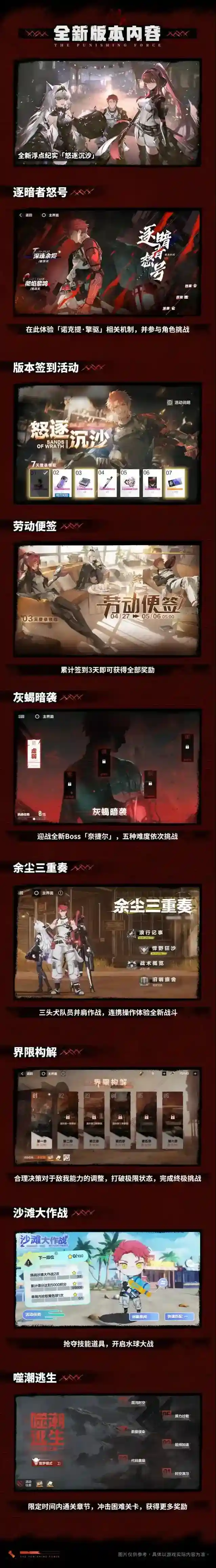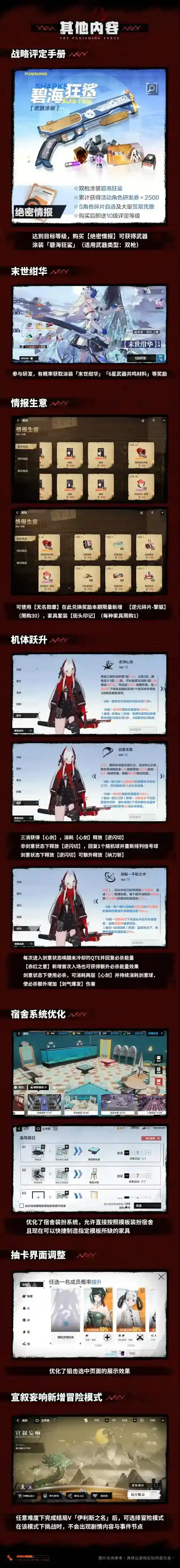 ♦界限构解合理决策对于敌我的能力调整,打破极限状态,完成终极挑战♦沙滩大作战抢夺技能道具,开启水球大战♦噬潮逃生:时隙之潮限定时间内通关章节,冲击困难关卡,获得更多奖励♦战略评定手册-怒涛档案可获得武器涂装「碧海狂鲨」(适用武器类型:双枪)♦末世绀华参与研发,有概率获取特效涂装「末世绀华」,武器涂装「卢佩卡里亚」等奖励♦荒原猎犬-材料关可使用活动货币「无名勋章」在情报生意-活动商店兑换奖励。新增「逆元碎片-擎驱」(限购30个),家具套装「街头印记」♦机体跃升「露西亚·深红之渊」获得跃升♦宿舍系统优化,抽卡界面调整,宣叙妄响新增冒险模式具体详情,指挥官们可查看大图