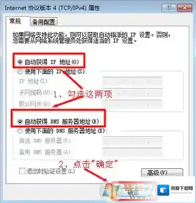 5、勾选“自动获得IP地址”和“自动获得DNS服务器地址”选项– 点击“确定”