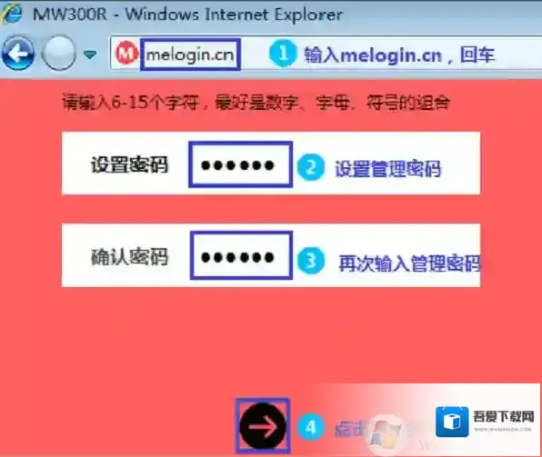 打开Win7电脑上的浏览器,在浏览器地址栏中输入:melogin.cn 并按下回车– 在弹出界面的“设置密码”框中自定义设置一个登录密码– 并在“确认密码”中再次输入登录密码– 点击 确定。