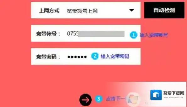 如果你的宽带符合上面介绍的情况,“上网方式”就应该选择:宽带拨号– 然后填写“宽带帐号”、“宽带密码”– 点击“下一步”。
