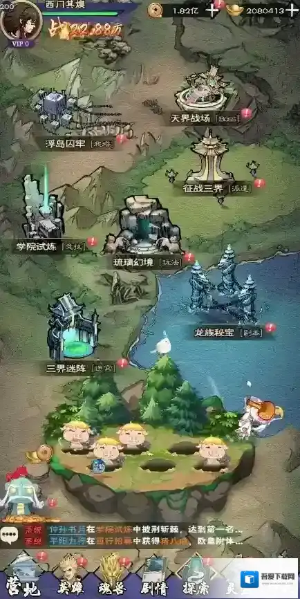 四、探索成长在推进主线剧情之余,可以通过各种探索玩法,获得丰富奖励来提升自己的战力!点击“探索”按钮可快速进入各类玩法界面,例如天界战场(BOSS战)、浮岛囚笼(爬塔玩法)、征战三界(派遣玩法)等等,都等着大家自行前往探索。西行者也可以查看「西行锦囊」系列攻略,获取这些玩法的详细介绍!
