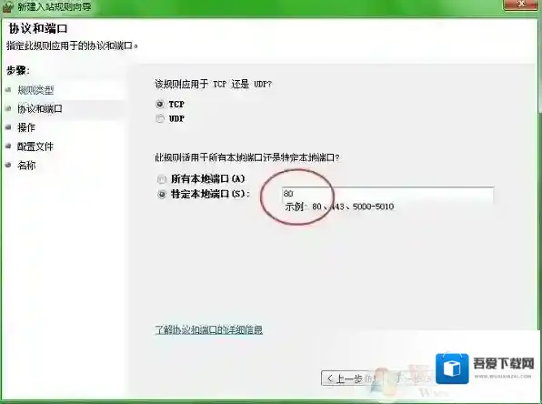 3、在“要创建的规则类型”中,点选“端口”,下一步,选择“TCP”,点选“特定本地端口”后填入端口号80。