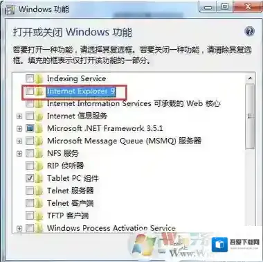 4、点击“打开或关闭Windows功能”后,就打开如下图所示的Windows功能对话框,在上面我们可以看到IE9。