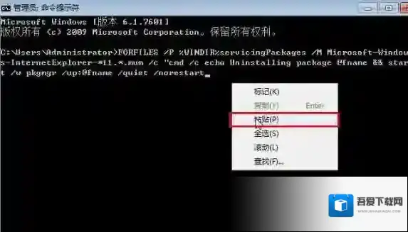 3、在命令提示符中按照不同浏览器版本输入卸载代码,复制起来,在命令提示符框中单击右键,选择“粘贴”,按下回车键即可将其卸载了卸载IE9输入: FORFILES /P %WINDIR%servicingPackages /M Microsoft-Windows-InternetExplorer-*9.*.mum /c “cmd /c echo Uninstalling package @fname start /w pkgmgr /up:@fname /quiet /norestart卸载IE10输入: FORFILES /P %WINDIR%servicingPackages /M Microsoft-Windows-InternetExplorer-*10.*.mum /c “cmd /c echo Uninstalling package @fname start /w pkgmgr /up:@fname /quiet /norestart卸载IE11输入: FORFILES /P %WINDIR%servicingPackages /M Microsoft-Windows-InternetExplorer-*11.*.mum /c “cmd /c echo Uninstalling package @fname start /w pkgmgr /up:@fname /quiet /norestart