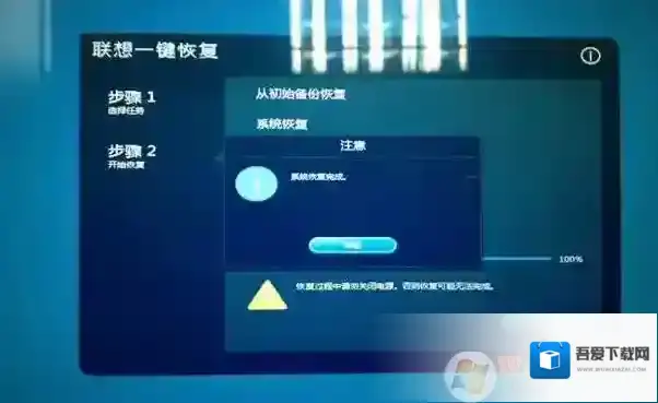 注意:在开始恢复系统前,请确认已接入外接电源适配器,确保供电正常。如未接入外接电源,则无法进行系统恢复。四、一段时间后恢复完成。时间一般在20分钟左右。