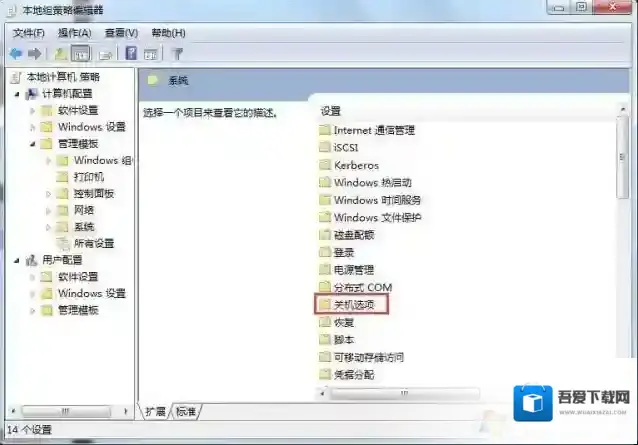 6、在该页面中找到“关机选项”,并双击它。