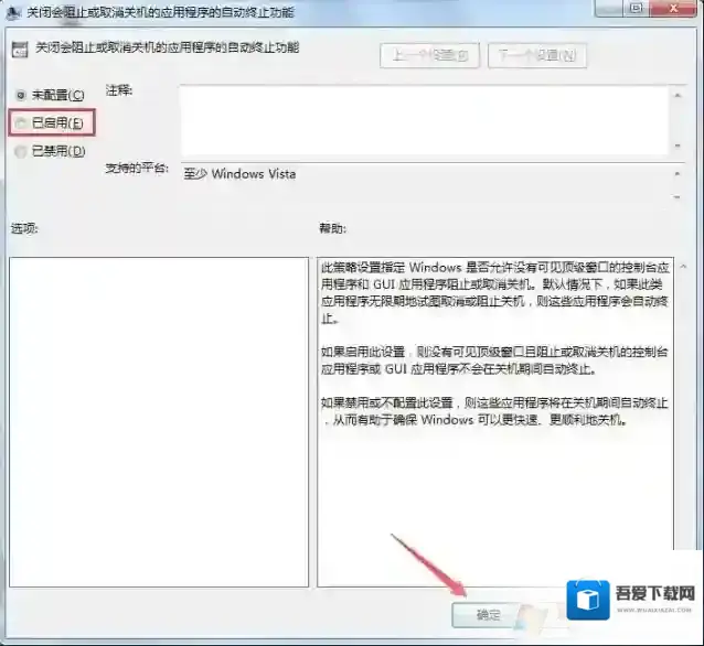 8、弹出的对话框中,选中“已启用”,然后单击确定就可以了。这样当再遇到未关闭程序时,Windows 7系统将自动终止,这样可以让关机更快。
