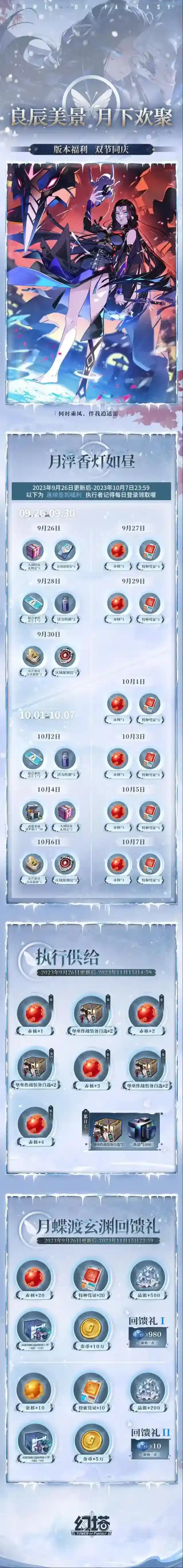 「月蝶渡玄渊」版本福利放出,版本执行供给累计登录7天,领赤核*10及1000墨晶。双节同庆,12天领12抽,9月26日版本上线后,签到领赤核*6、特种凭证*6。