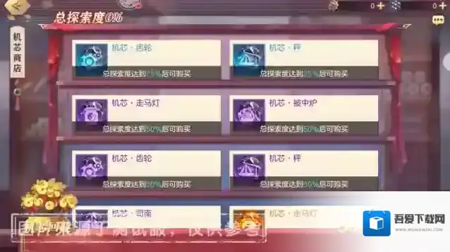 小将军在探索过程中获得的「机芯」可用于镶嵌百巧机盘,「跃迁齿轮」可用于升级百巧机盘,「机关钥石」可用于解锁百巧机盘节点,镶嵌和升级均可提升百巧机盘的加成属性,同时,随着探索度的上升,小将军也可在机芯商店中购买「机芯」,小将军若有重复的机芯,也可在机芯商店进行分解回收。