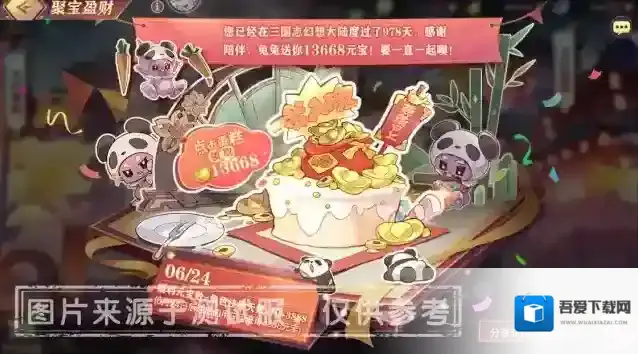 活动期间,小将军进入聚宝盈财活动界面,可根据角色创建天数,领取数量不等的元宝,保底可以领取元宝*3888,元宝计算公式为:3888+小将军的角色创建天数*10,参与公测的小将军最多可以累计元宝*18498,同时小将军分享活动页可额外获得元宝*300。