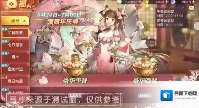 活动期间,每日将为小将军们奉上豪华午晚餐,每日午晚餐可分别额外领取「闹市赠礼*1,元宝*288」,小将军们还请莫要错过!