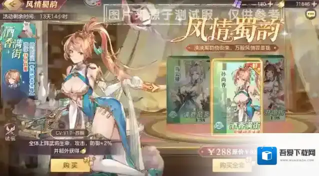 酒香满街·孙尚香:活动期间限购1次,售价98元,可搭配价值30元的蜀韵·酒香满街动态头像打包出售,打包折扣售价:118元。
