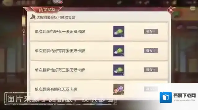 在活色生香中,小将军可以使用「淡雅素锦」、「绚烂彩锦」进行吃喝玩乐或肆意逍遥,每次吃喝玩乐或肆意逍遥将获得四张卡牌,根据卡牌组合的稀有度小将军将获得不同数量的「灵韵宝珠」、「机巧秘礼」、和「闹市赠礼」,当「灵韵宝珠」达到指定值时,小将军可领取自选奖励。与此同时,小将军解锁不同的卡牌组合,亦可领取图鉴奖励。
