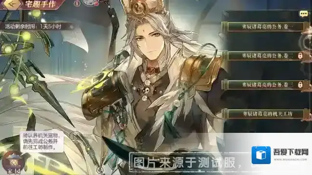 活动期间,小将军协助弈辰诸葛亮完成三卷公务即可获得「雅致匠心主城皮肤」、「无双助力任选包」等奖励;同时,小将军可选择留言建议人,正确选择每卷留言的建议人,可额外解锁机关工坊材料。