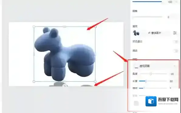 如图,我们点击需要设置阴影的图像,在右侧就可以看到设置阴影选项了,我们选择好合适的角度、长度、模糊度、距离即可添加完成。