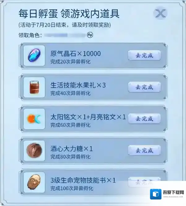 孵化完成后旅者便可将孵化出来的奖励领取到对应角色的邮箱内(包括异兽元胎、异兽临时卡或千年进化丹)。当孵蛋数量达到孵化进度要求后,还可以在领取礼包中领取孵化进度对应的道具奖励!