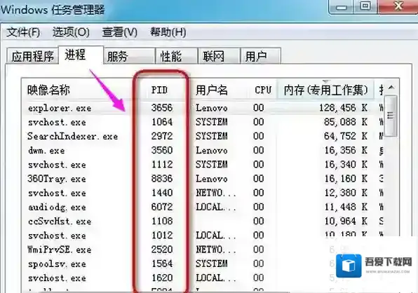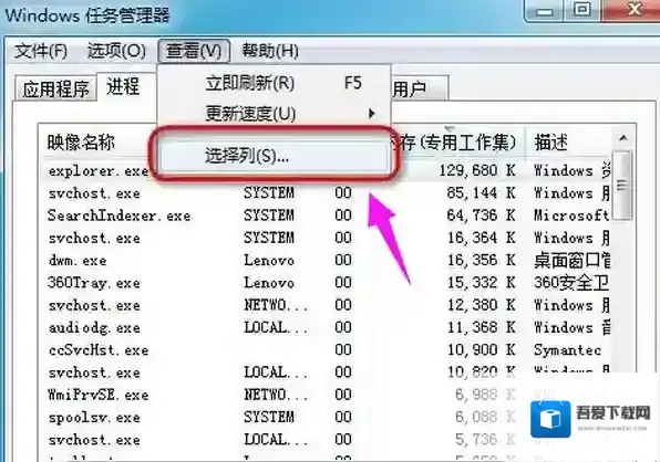 4、打开任务管理器,依次点击查看→选择列,然后额外选择显示PID(进程标识符);