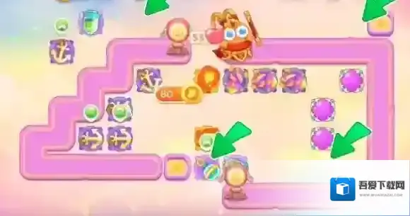 1、这一关需要使用的炮塔是:船锚、魔法球、泡泡塔、火瓶、毒针、烟花,我们使用火瓶开图,船锚输出。