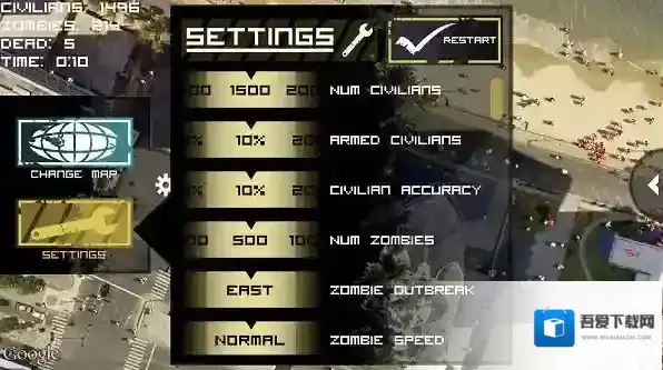 打开游戏右上角的设置按钮,参数中可以对平民和僵尸分别设置,平民的数量、平民武装的百分比、僵尸的数量、僵尸移动的速度和僵尸出现的位置等等一系列参数。