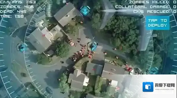 游戏打开就是这样一幅卫星地图,不像Osmos一样你控制其中一个人或者僵尸慢慢成长,你无能为力。身为旁观的上帝,世上万物都是自己的子民,他可以看着人类为了温饱屠杀牲畜,如今也不会介入僵尸和人类的战争。此游戏用了google的卫星地图,房屋上的瓦片,汽车,树木等物体都清晰可见。应用中没有人类穿红色的衣服,红色成了区分人类和僵尸的标志。