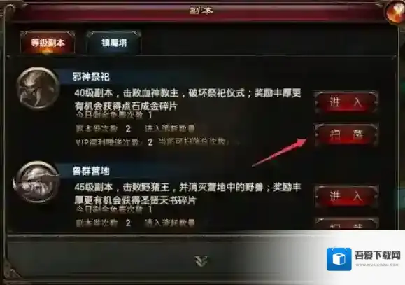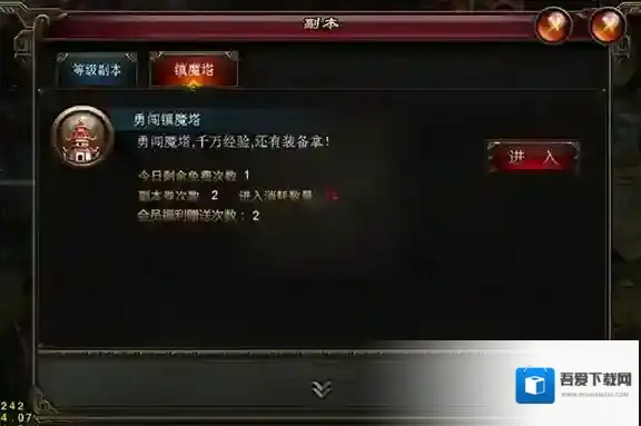⑤镇魔塔:前期后期主要获得经验方法之一。于副本一样,每日一次免费机会,购买副本卷轴课额外增加2次机会。开通青铜VIP可额外增加1次机会。开通黄金VIP额外赠送2次机会。
