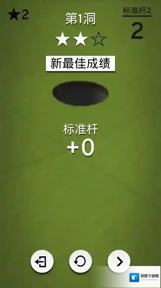 3、成绩结算完成“第1洞”,显示“新最佳成绩”“标准杆+0”,可获星级★2,推进关卡,挑战更多球洞。