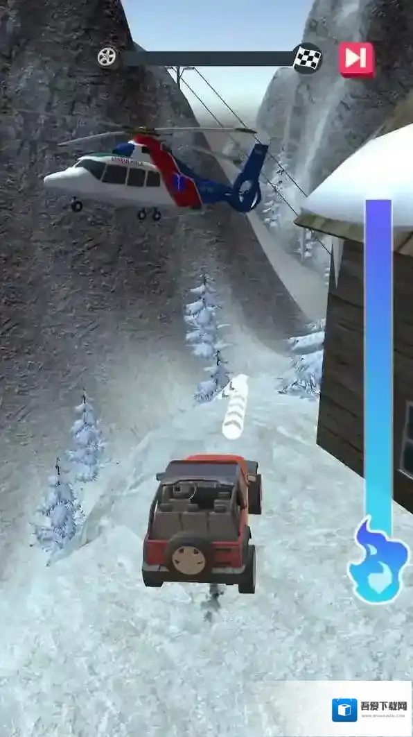 1、雪地场景驾驶越野车,避障碍(如滚木),利用加速道具冲线。